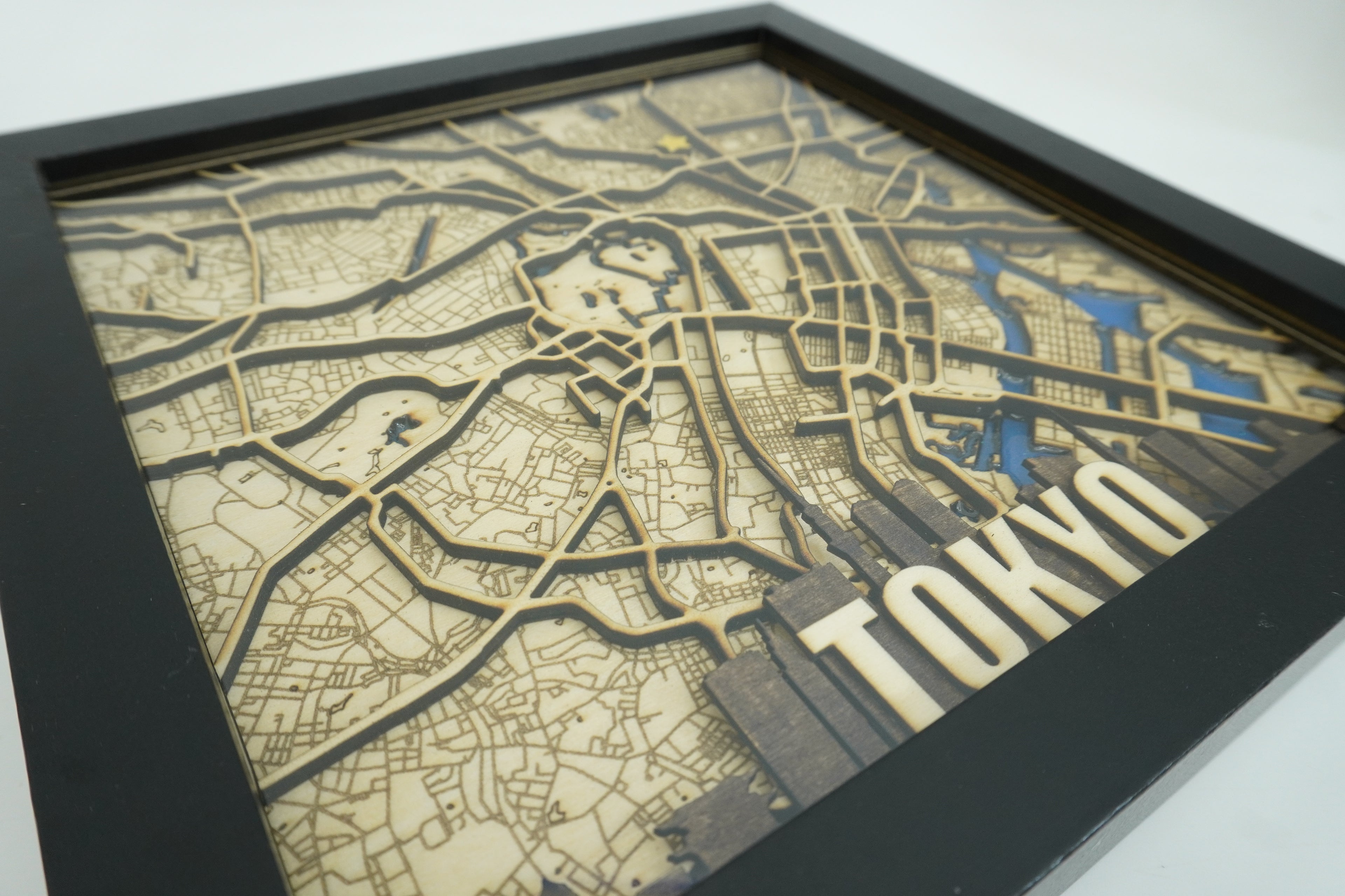Laser-engraved wooden maps of any city with blue inlays for water, your...